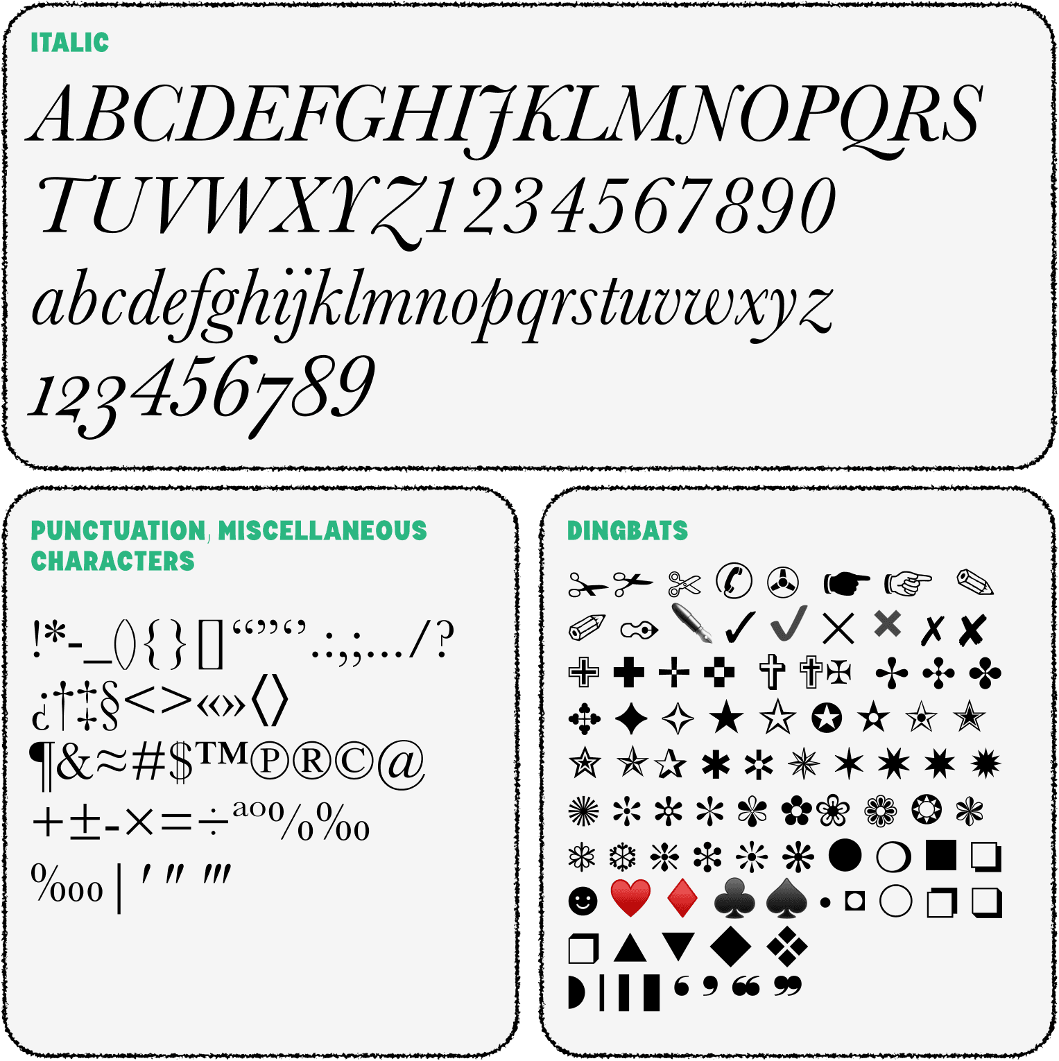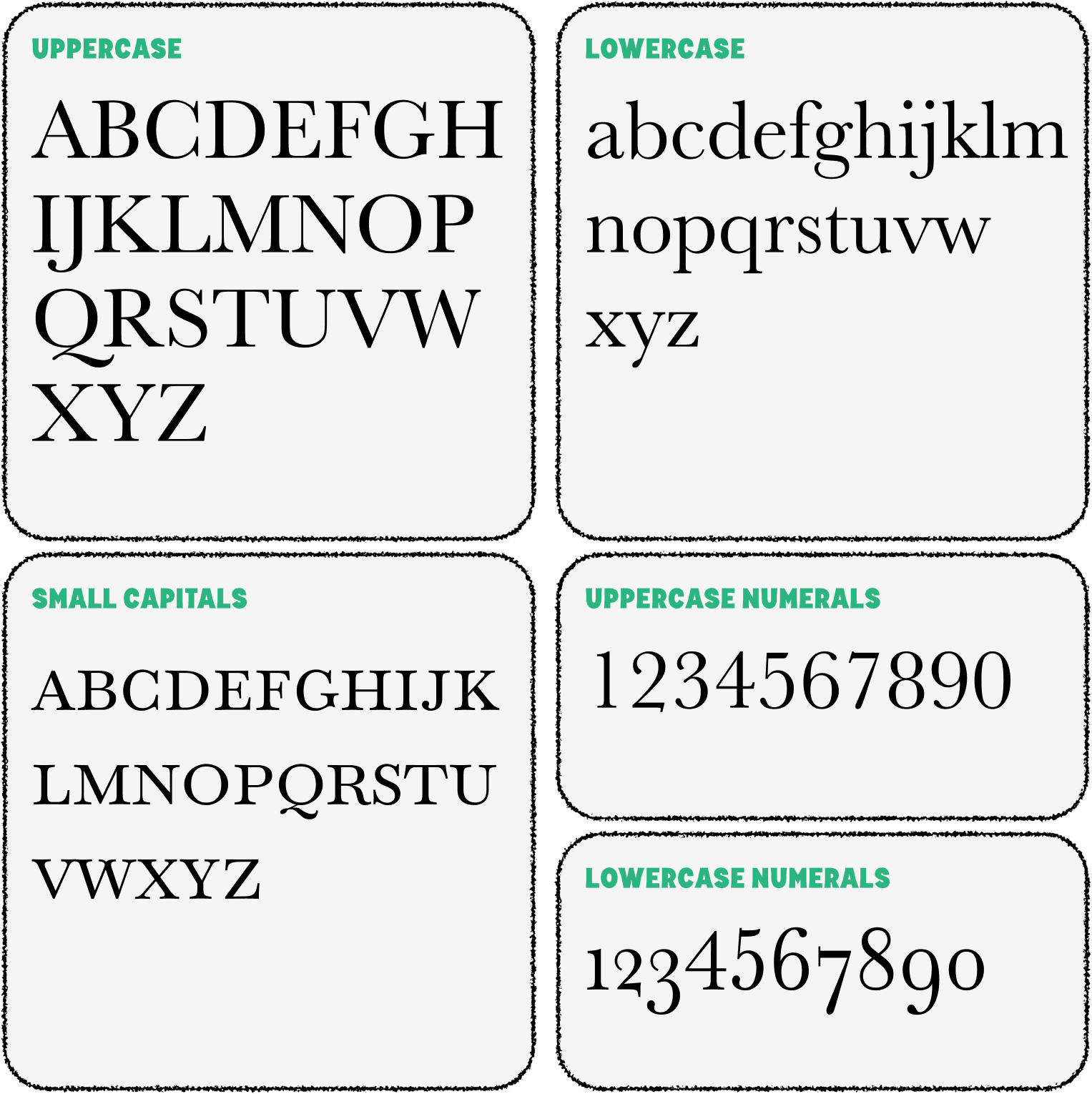 Bộ “font" hoàn thiện của một “typeface” bao gồm nhiều hơn 26 chữ cái, 10 chữ số và một vài dấu câu như ta thường hay thấy. Dưới đây là những thành phần cơ bản của một bộ “font" mà ta cần ghi nhớ khi làm việc với nó: